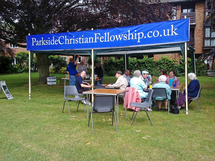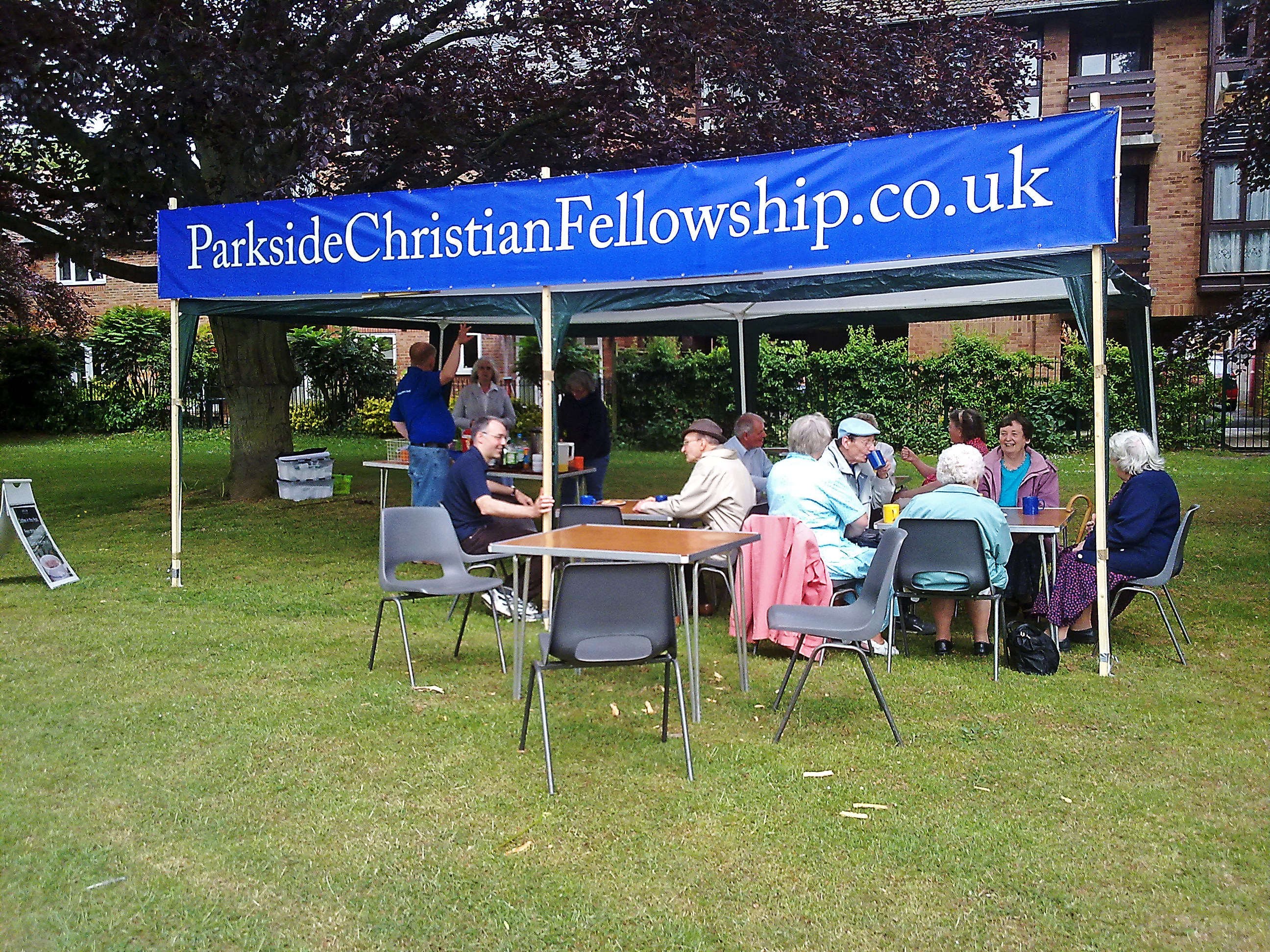 Following heavy overnight rain, we gathered at Parkside at 10am for a short time of prayer. After this, with the weather improving, we decided to set up the marquee, Parkside sign and tables in Kidwells park, behind Parkside, as planned.