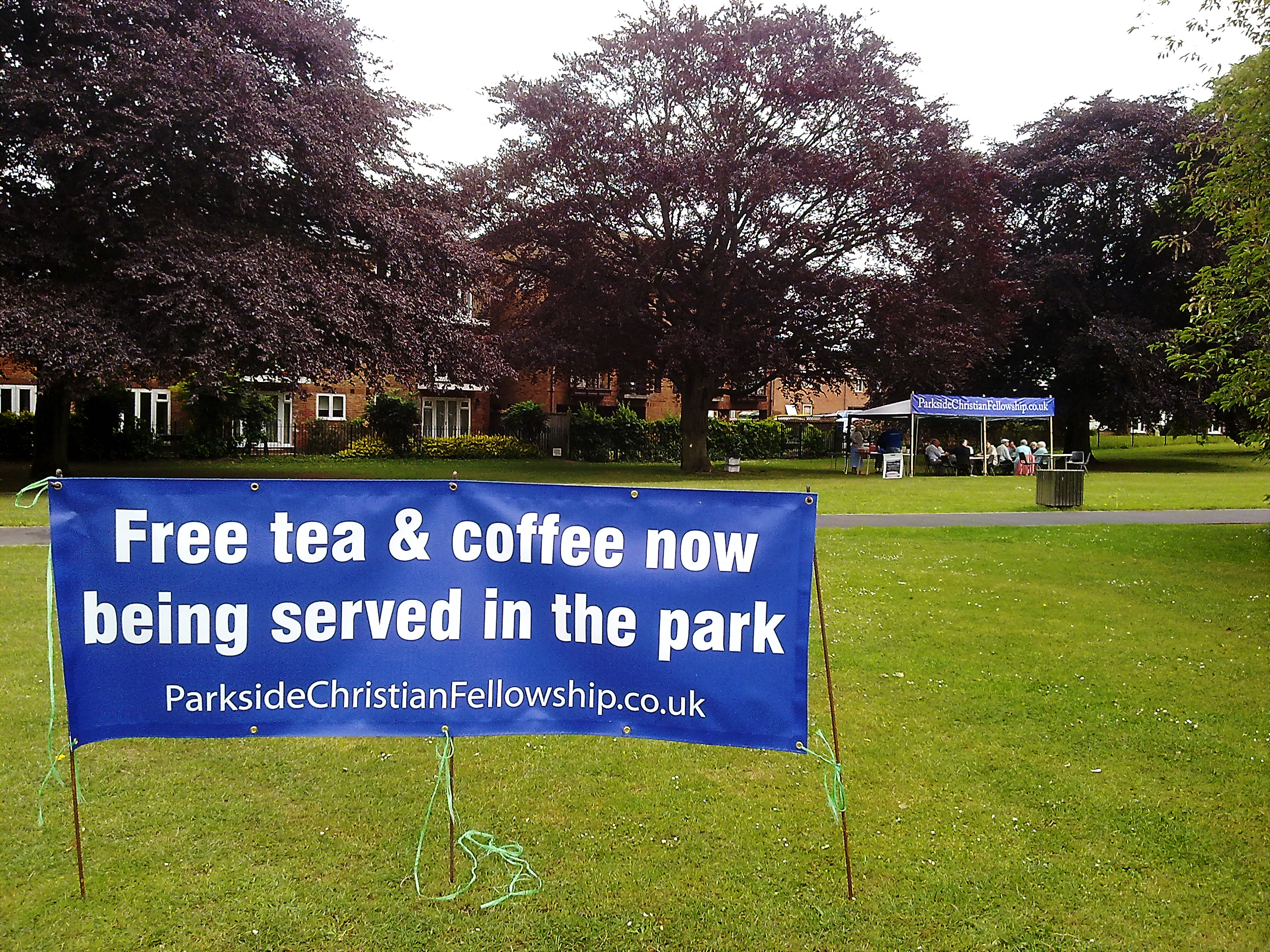 We decided to put the ‘Free tea and coffee’ banner out in the park facing the town centre so it would be eye-catching as people walked through the park, rather than on the front wall.