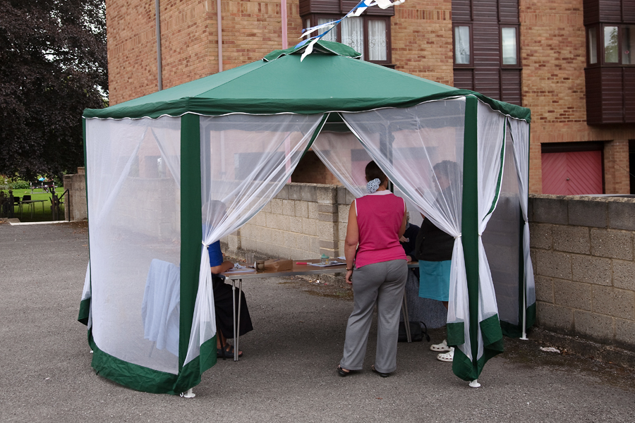 We set up one marquee in the car-park and the second one out in the park. In addition, we had a smaller marquee set out in the car-park as a welcome tent. Here, Pam and Angela greeted visitors and gave them the option to wear a sticky label with their name on.