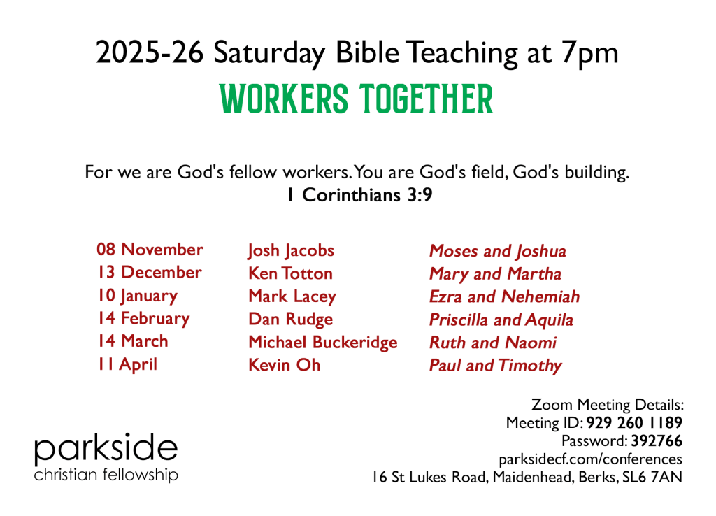 This year in our Saturday Bible Teaching, we’re looking forward to a series on Partnerships in the Bible, called ‘Workers Together‘. Our first conference is on 8 November, starting at 7pm.